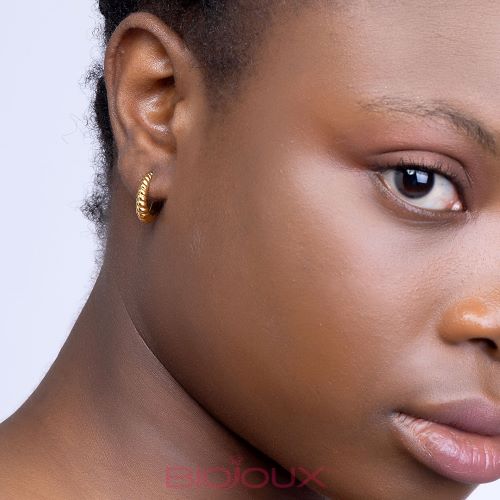 Сережки-кільця золотистого кольору, рельєфні, хвилясті.