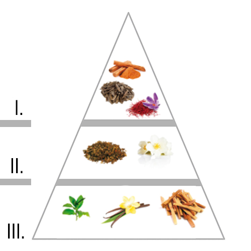 I.Верхні ноти: зелене яблуко, горіх мускатний, шафран, уд, кориця, груша, ладан