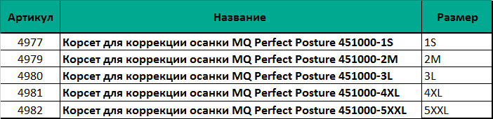 Корсет для корекції постави MQ Perfect Posture 451 допомагає тримати хребет у правильному положенні. За рахунок регульованих лямок можна підігнати корсет під індивідуальні анатомічні особливості людини. Використовується для «м'якої» корекції постави при сутулості, кіфозах, сколіозах, м'язової слабкості, а також в реабілітаційний період після операцій. MQ Perfect Posture «нагадуючи» нашому мозку правильне положення спини і плечей може допомогти відновити правильну поставу завдяки м'якому витягуванню, яке він надає. Можна носити вдома, за кермом, в офісі і під час занять спортом. Корсет представлений в 5 розмірах: S, M, L, XL, XXL.