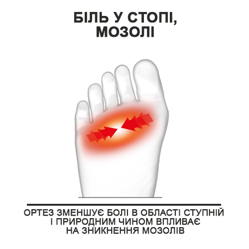 | Призначення | При вальгусній деформації та мозолях (на передній частині стопи) рівномірно розподіляє тиск, зменшує біль. |
