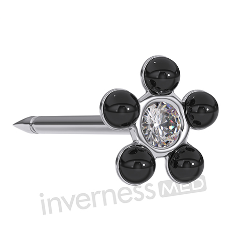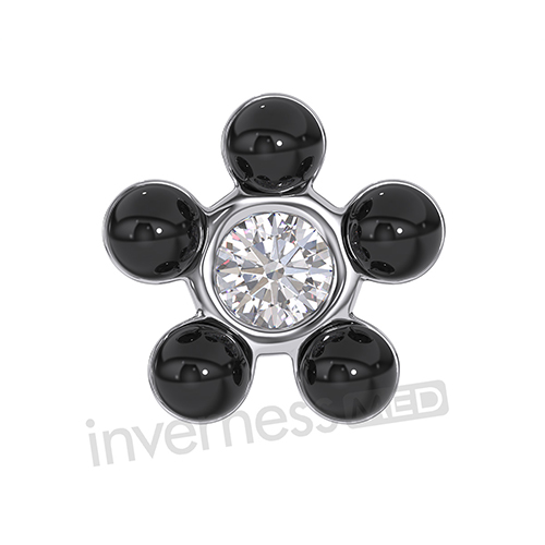 Сережки виконані з гіпоалергенного, біосумісного металу ніобію у формі квітки. По колу інкрустовані кам'яними перлинами чорного кольору, в центрі білий / прозорий кристал. Діаметр 5мм. Сережки мають тонкий (0.73мм) гострий кінчик, що гарантує делікатну процедуру пірсингу. Безпечна застібка надійно закриває вістріє сережки. Кожна сережка упакована в герметичну, стерильну капсулу для проколювання.