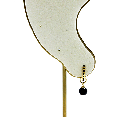 Сережки золотистого кольору, посипані чорними кристалами та перлиною, як підвіска.